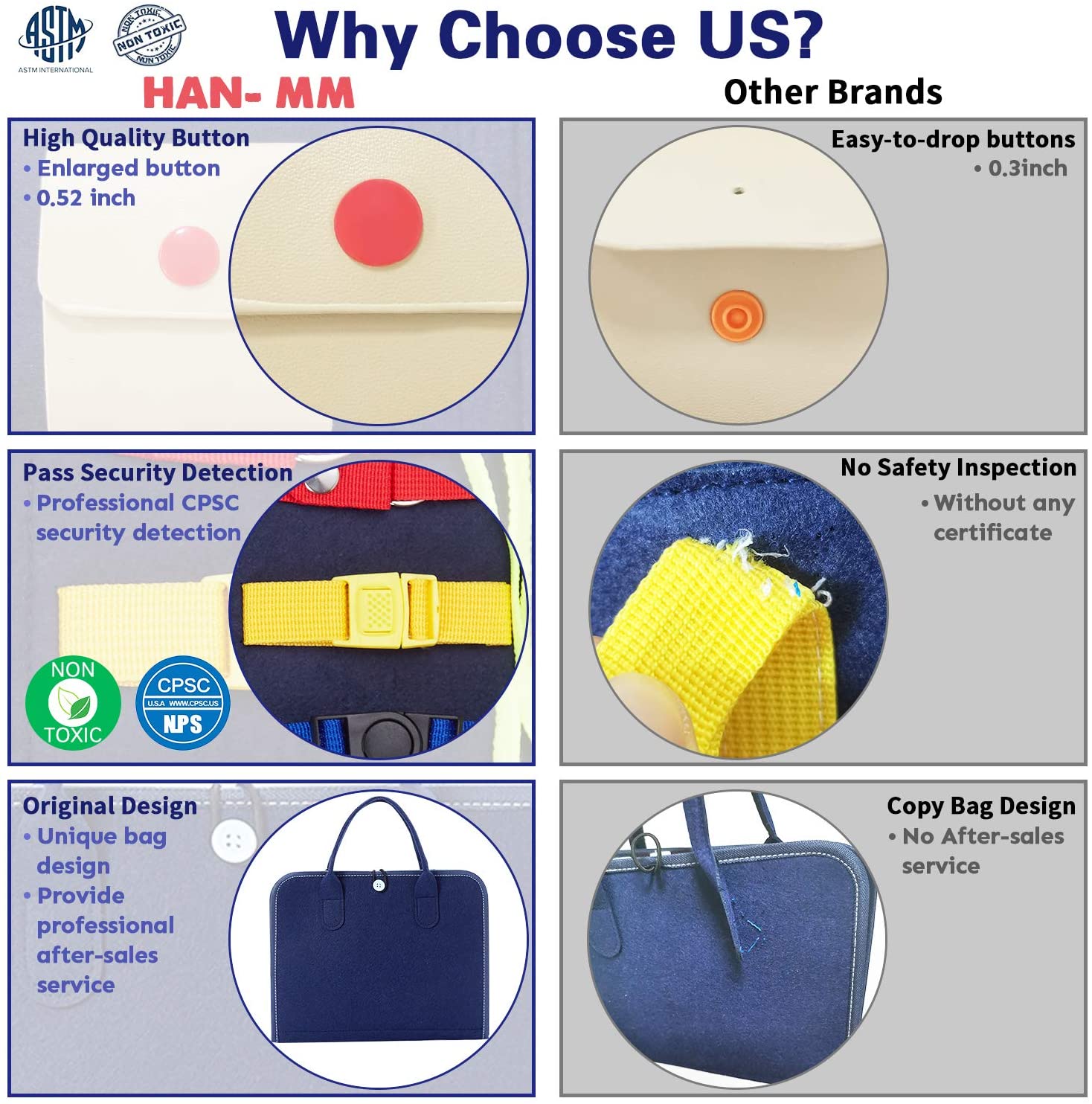 Safe & Well made: The montessori busy board is made of soft felt with soft edges and carefully sewn. Our busy board is CPC certified, odorless and safe. We have reinforced every accessory, ensure that the sewing part is exquisitely crafted and sewn firmly on the busy board, which can prevent small parts from being lost. Kids under 3 years old should play under parents supervision.